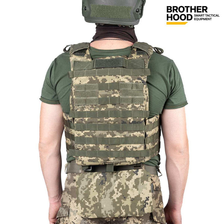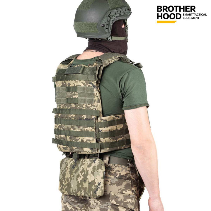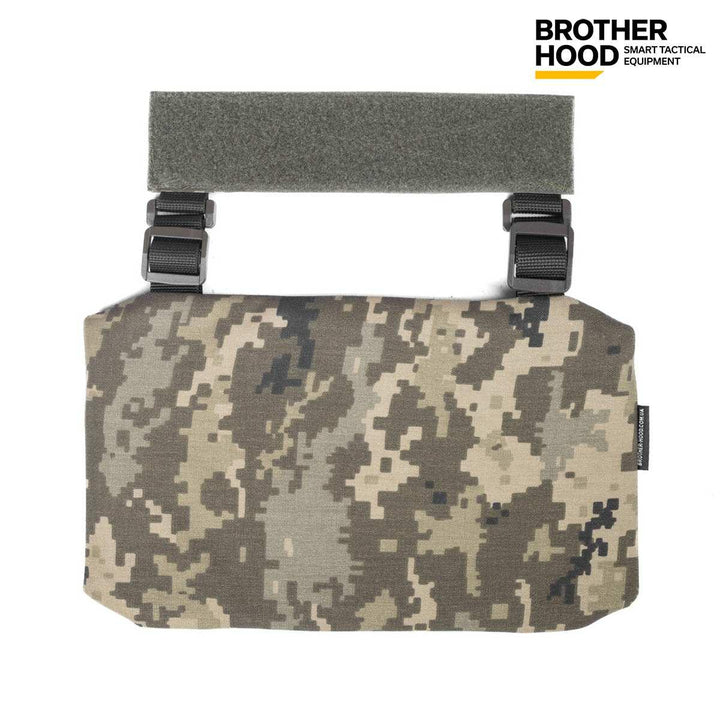 The Brother Hood 2.0 Pixel Cover Pocket is designed for securely holding a standard ballistic plate measuring 10.4" x 5.9", providing essential protection for the lower back. This practical and durable accessory is ideal for military, police, and rescue professionals who demand high-quality gear.