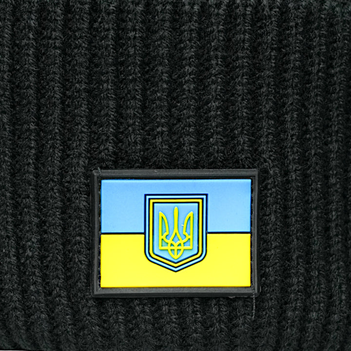 Black Fleece-Lined Knit Hat with Ukrainian Flag and Trident Emblem