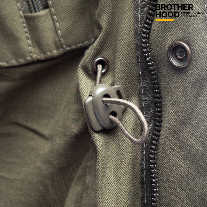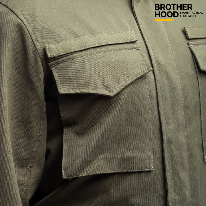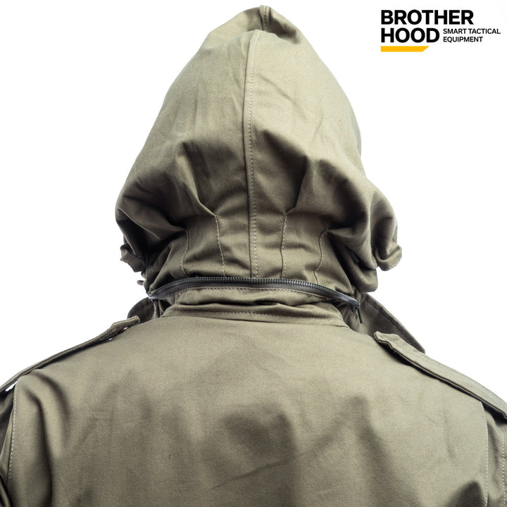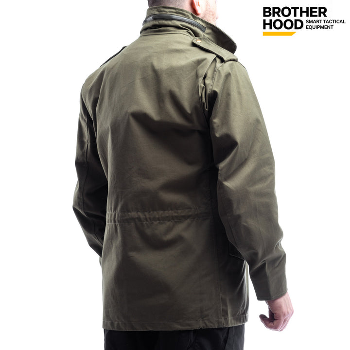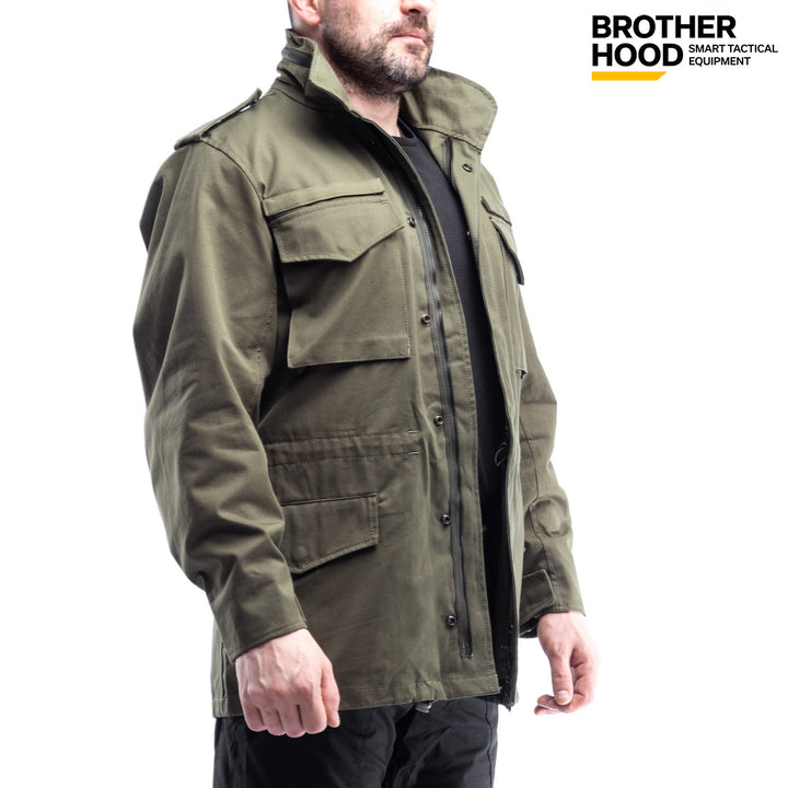 The Brother Hood M65 Tactical Jacket is a versatile, three-season olive jacket with a water-repellent finish, designed for both military use and everyday wear. Its classic 1965 design combines functionality with a modern urban style, making it perfect for active lifestyles.