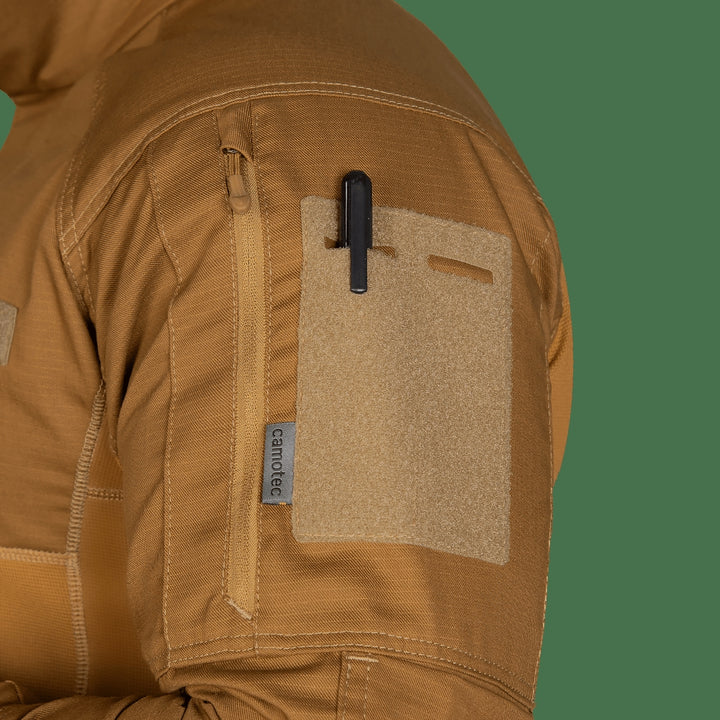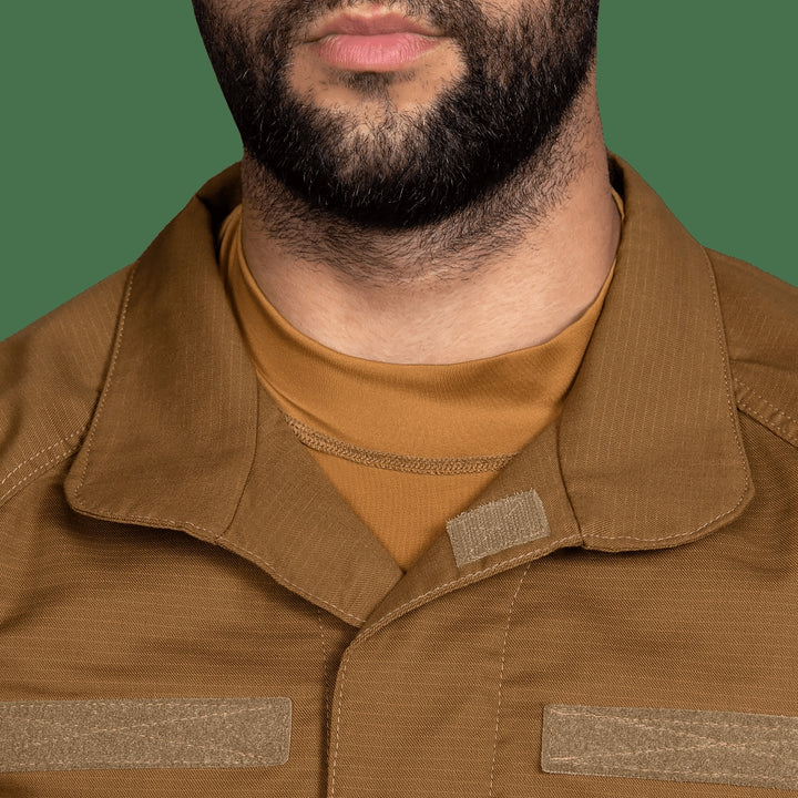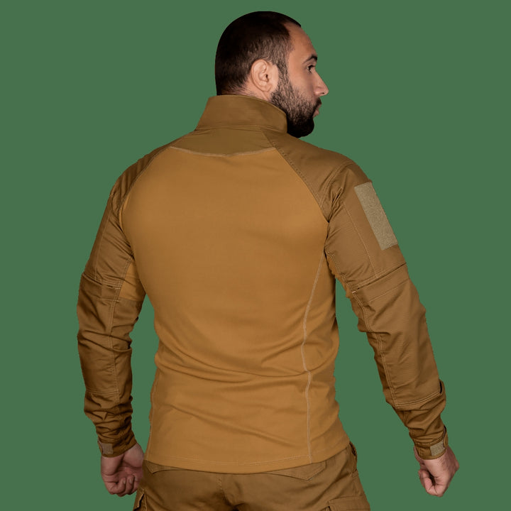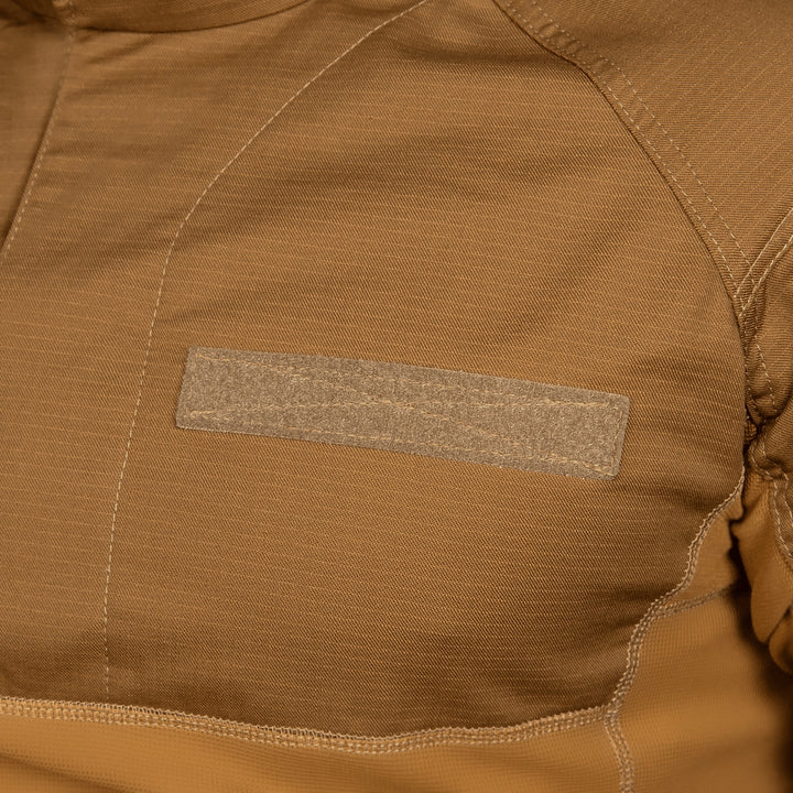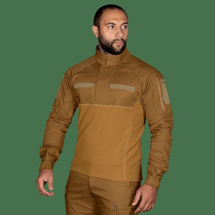 The CM Blitz Twill/CoolPass Pique Combat Shirt in Coyote (7208) is a tactical UBACS (Under Body Armor Combat Shirt) designed for wear under body armor, ideal for spring and summer use. This shirt combines breathable, durable materials with ergonomic design for intense operations.