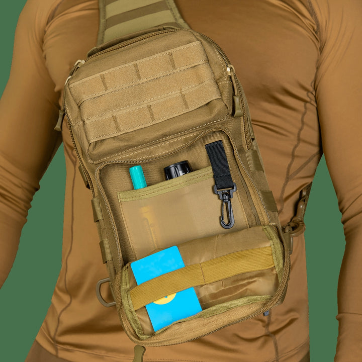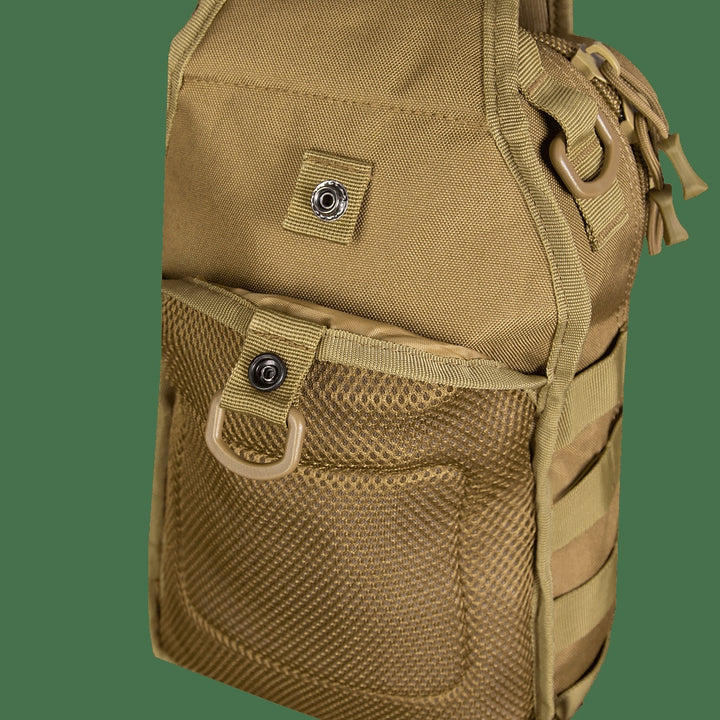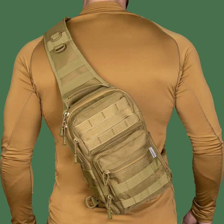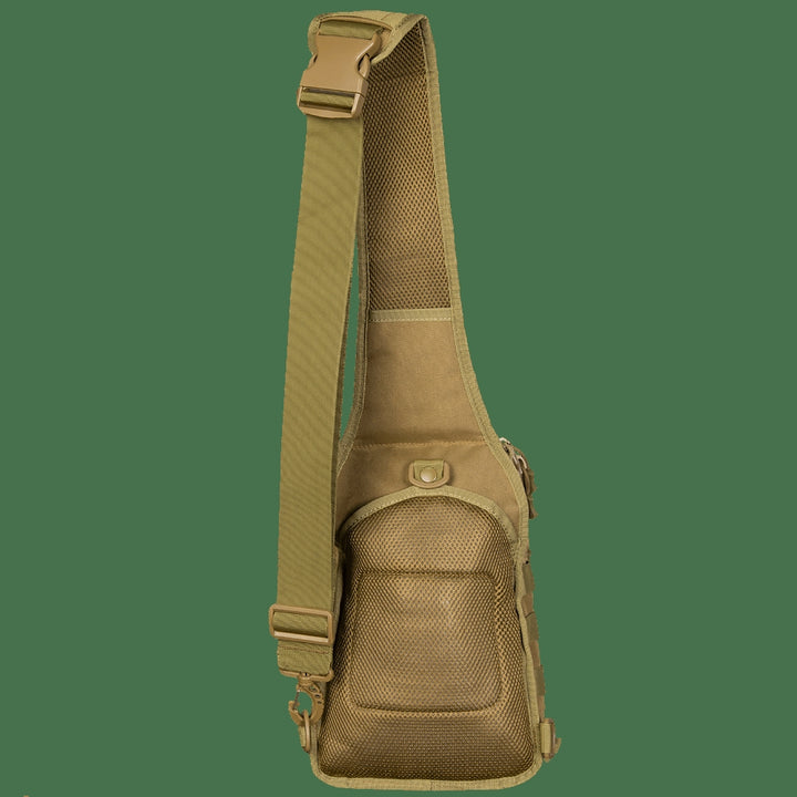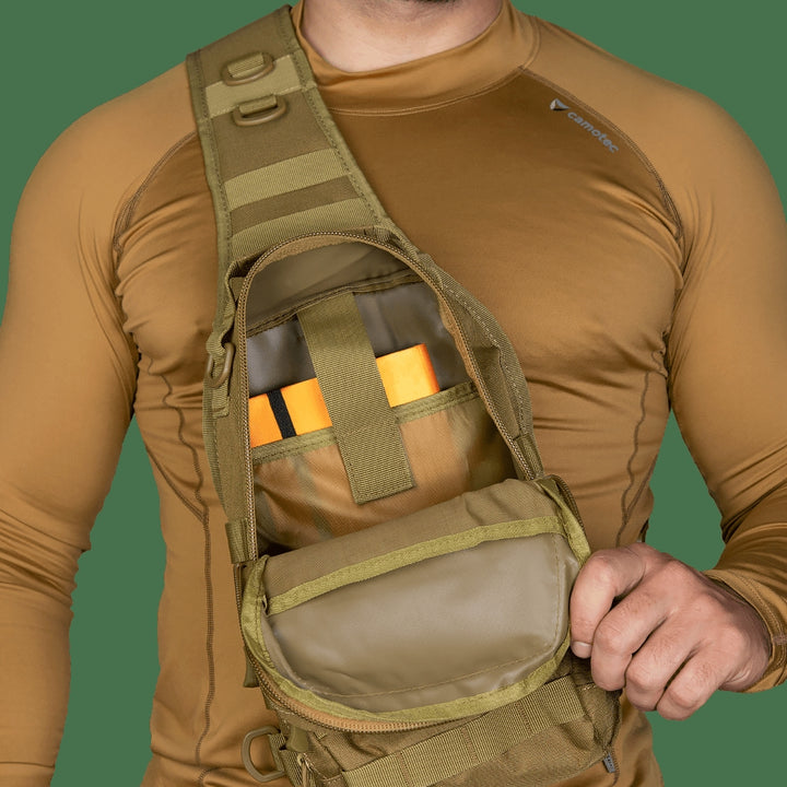 The COB Sling Bag in Coyote (7117) is a compact urban tactical bag designed for everyday use and demanding tasks such as security, military operations, tourism, camping, hunting, and fishing. Its versatile design allows for comfortable wear on the front, back, over the left or right shoulder, or as a regular handheld bag.