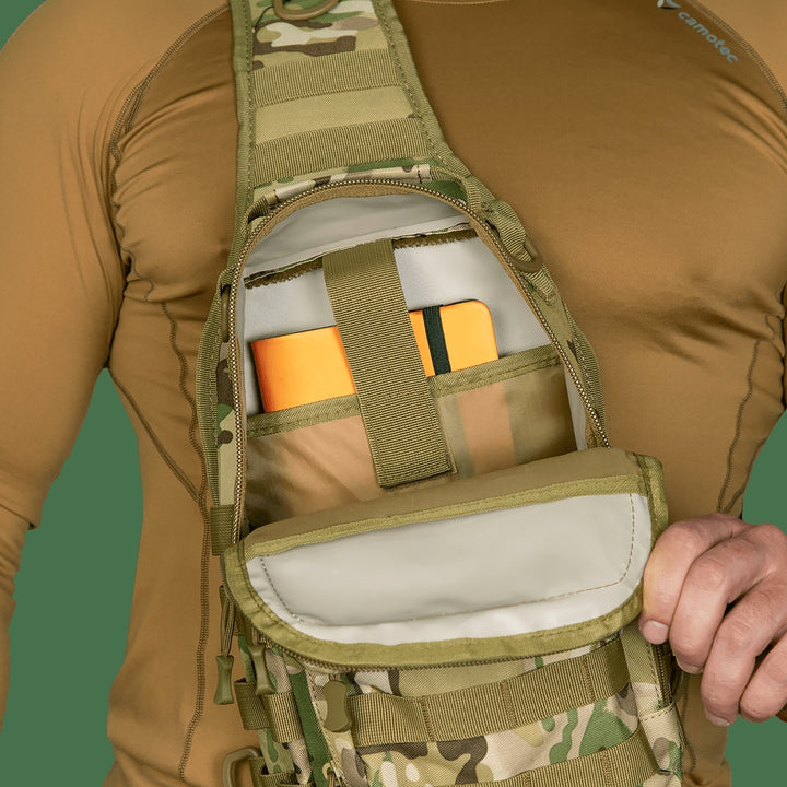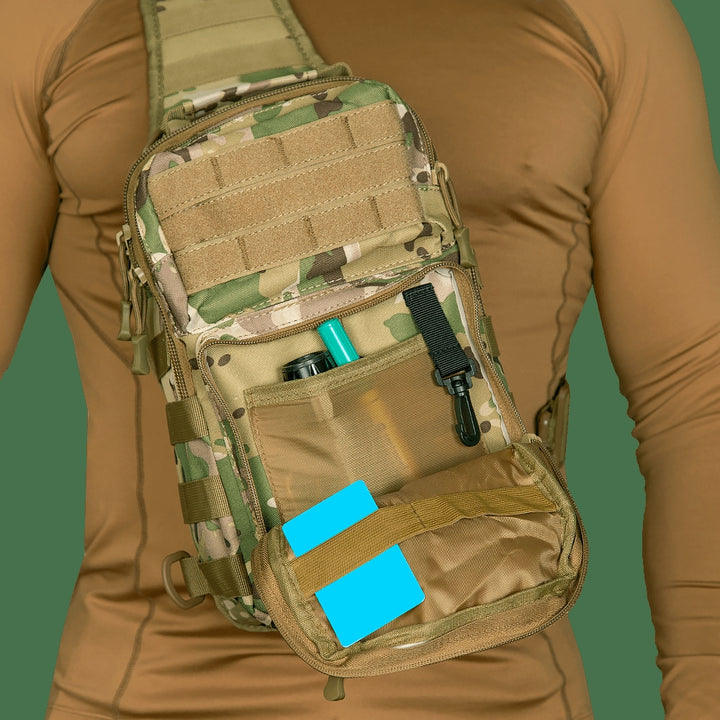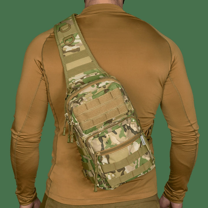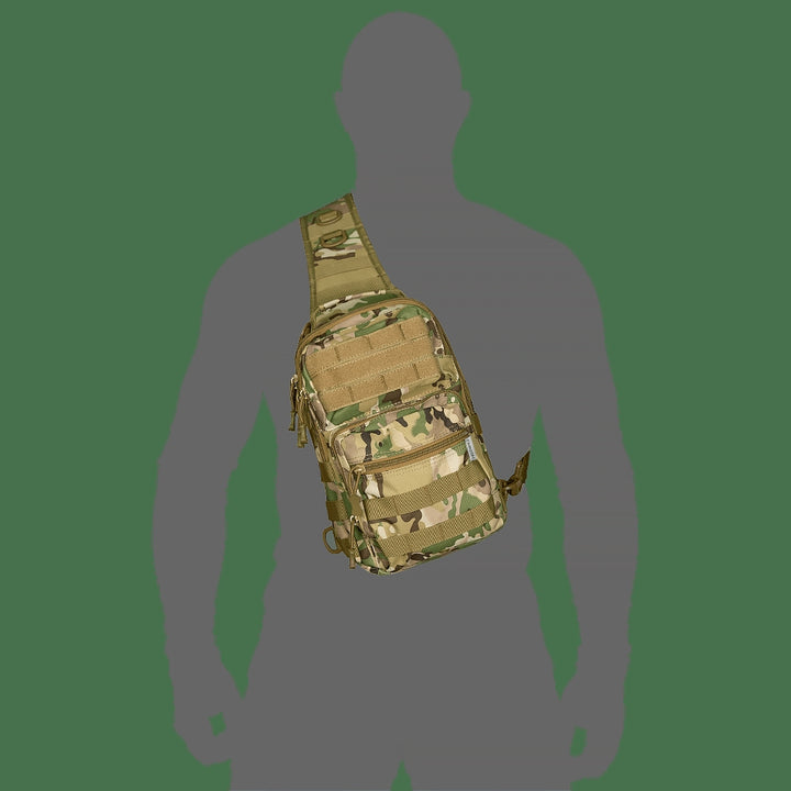 The COB Sling Multicam (7120) is a compact and versatile tactical bag designed for everyday carry while offering functionality for security and military personnel. Perfect for travelers, hunters, anglers, and campers, this bag serves as a reliable daily accessory.
