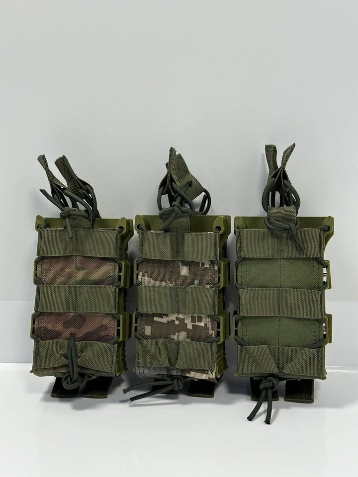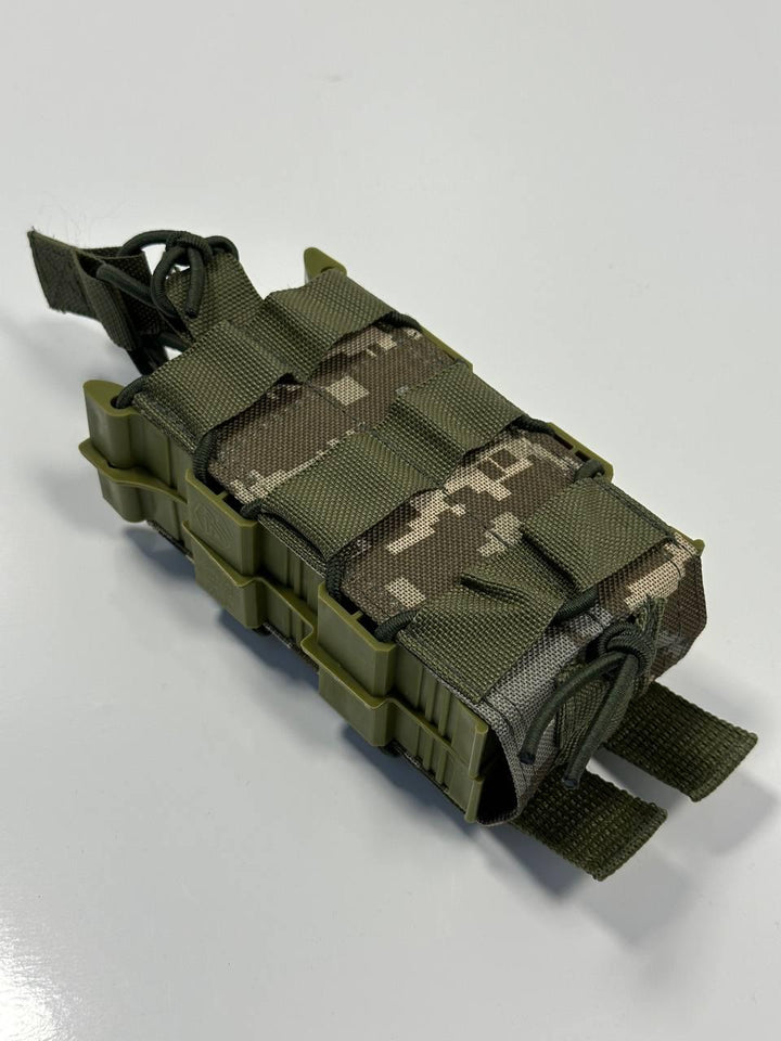 This pouch is ideal for tactical gear where quick access and modularity are essential. Its combination of durable fabric and plastic reinforcements ensures longevity and convenient magazine placement in the field. The product name "Double AK Mag Pouch (Pixel) (Multicam) (Olive)" reflects the described model and color options, making it versatile for both civilian and professional use.