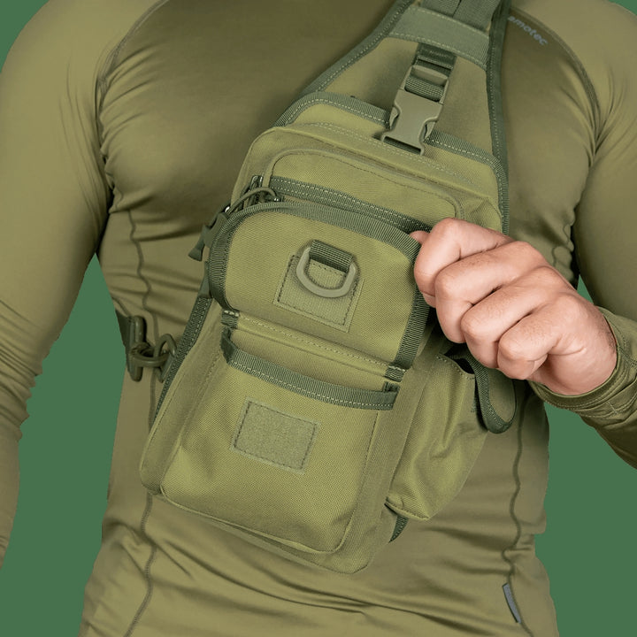 The Gunner Sling 2.0 in Olive (7115) is a tactical bag designed for security and military applications, while also easily adaptable for everyday use, hiking, and outdoor activities. Its compact, ergonomic design and thoughtful functionality make it a versatile accessory for shoulder carry, whether in front or at the back.