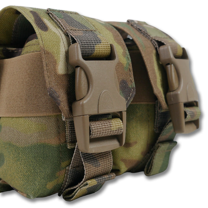 The dual grenade pouch is crafted from 1000D Cordura fabric, ensuring it is resistant to wear and tear while withstanding intense use in any conditions. Designed to securely hold two grenades, this pouch features hardware that meets the technical requirements of the Department of Defense.