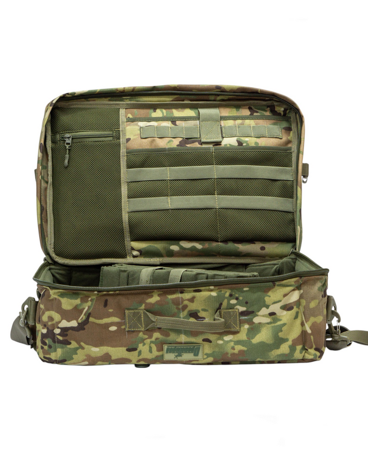 The Drone Carrying Bag is designed to securely transport your drone gear and personal items, offering ample space for up to 5 MAVIK sets or 2-3 sets plus personal belongings. Available in Multicam and Pixel colors.