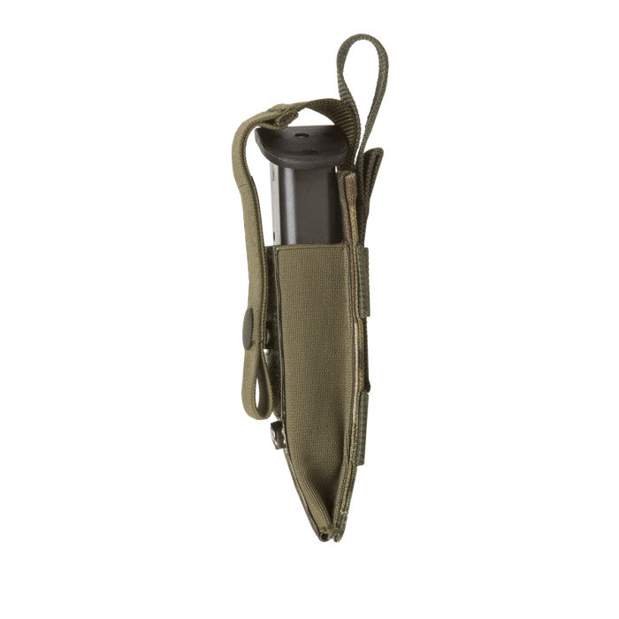 The military pouch is designed for the **functional carrying** of a pistol magazine, folding knife, or multi-tool. Equipped with dual buttons and elastic bands for enhanced retention, this accessory provides **secure storage** for your essential gear.