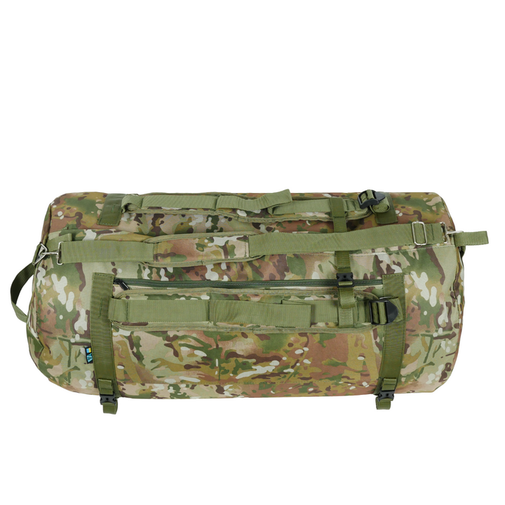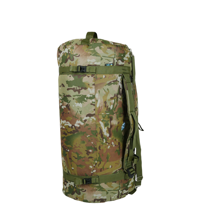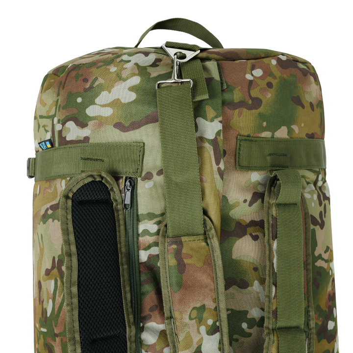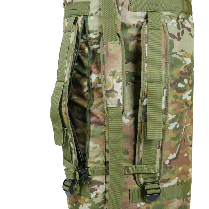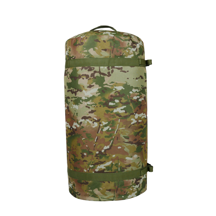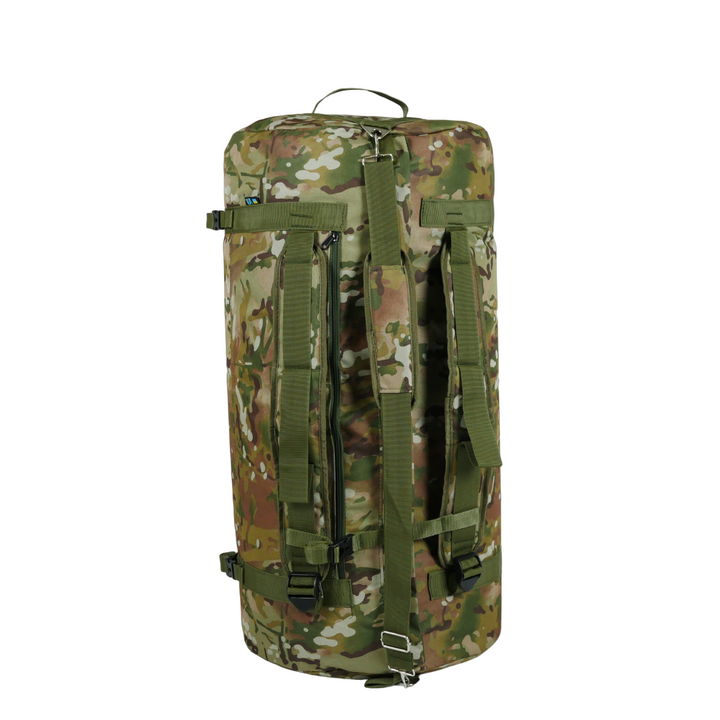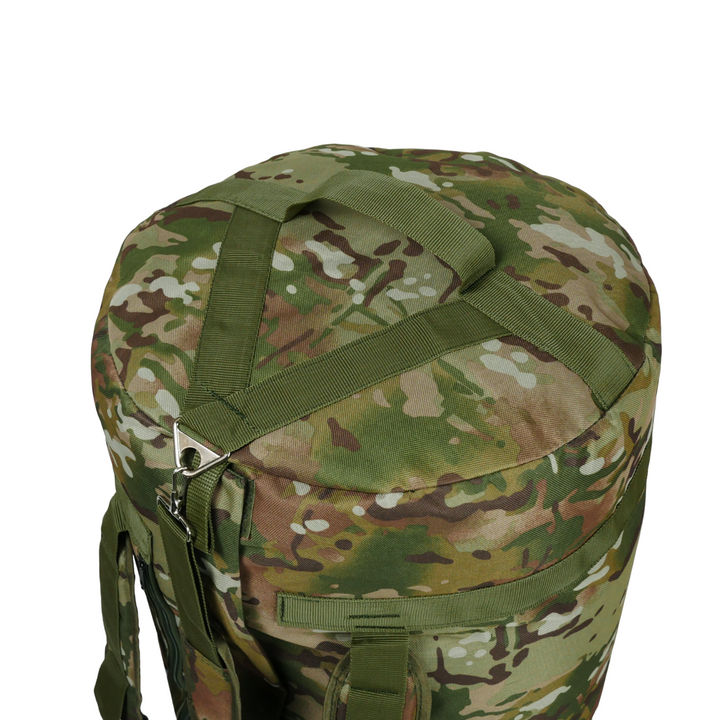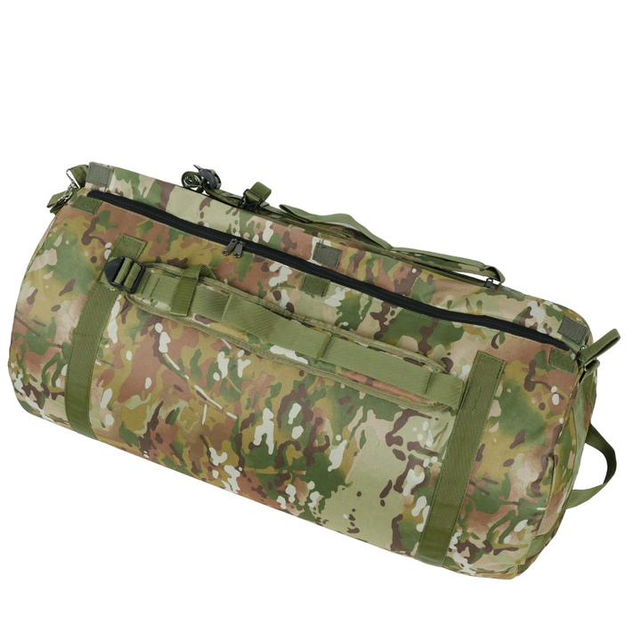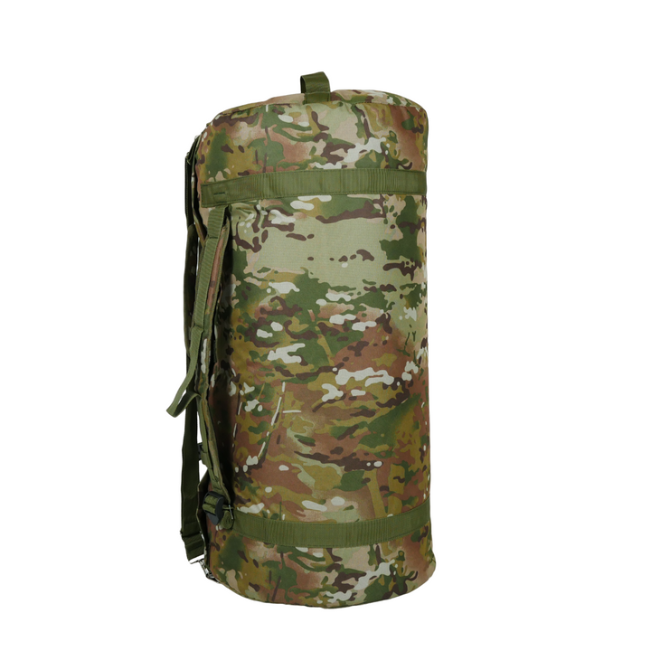 The duffel bag is designed for transporting personal belongings, military gear, sports equipment, or hunting accessories. Its unique feature allows it to be carried as both a bag and a backpack, providing versatility for outdoor activities.