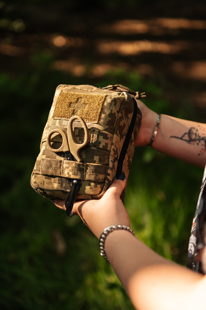 The medical pouch is designed for filling with medical supplies according to IFAK (Individual First Aid Kit) standards, serving as a basic individual medication kit. Its MOLLE system straps on the front allow for the attachment of additional pouches or scissors.