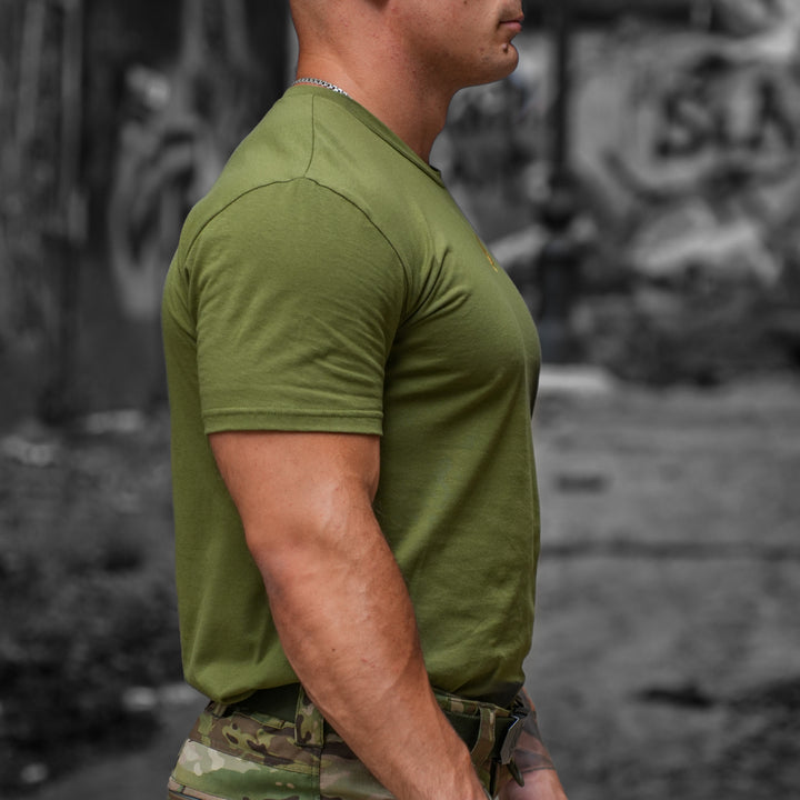 The Olive "Trident" Cotton T-Shirt is a high-quality and stylish addition to your wardrobe, perfect for everyday wear. Made from 100% cotton, this t-shirt ensures comfort and durability, thanks to its natural, breathable fabric.