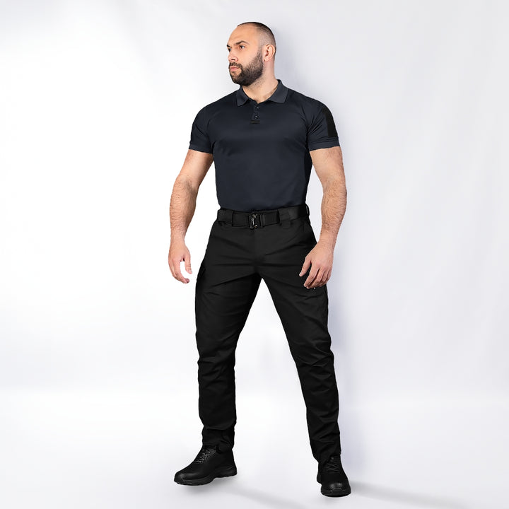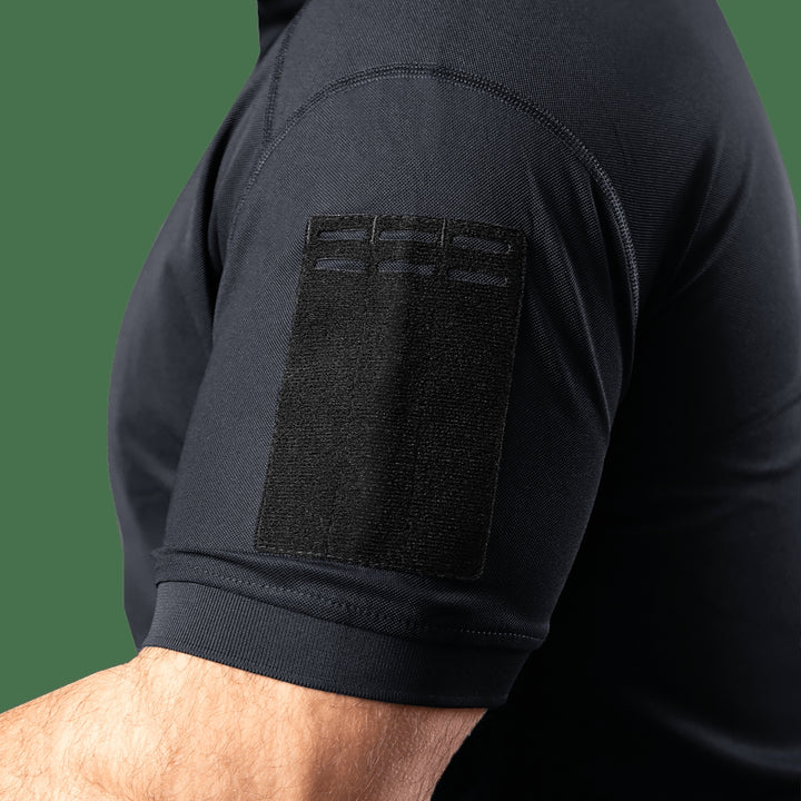 The tactical polo shirt is designed for police, emergency services, and security personnel, offering functional details for enhanced utility. Key features include a chest loop for additional gear and Velcro patches on the sleeves for badges and insignias.
