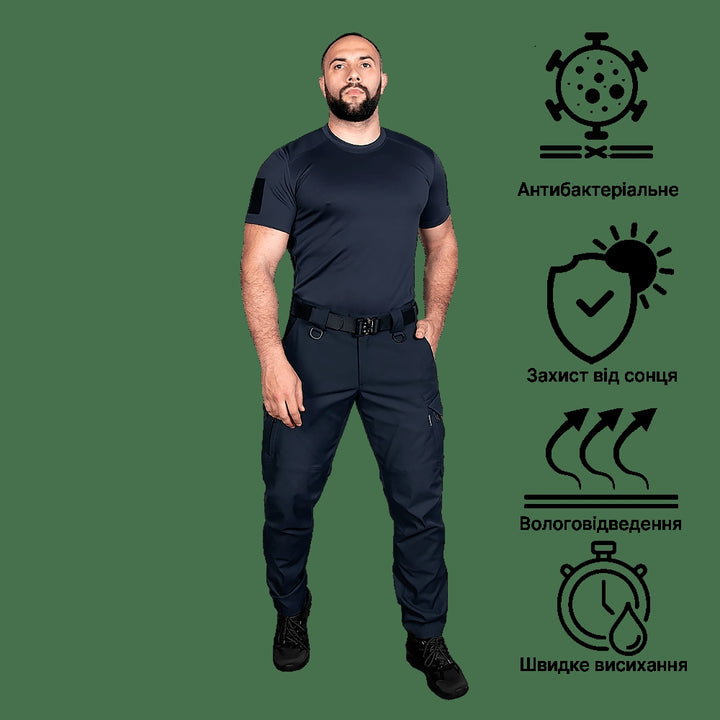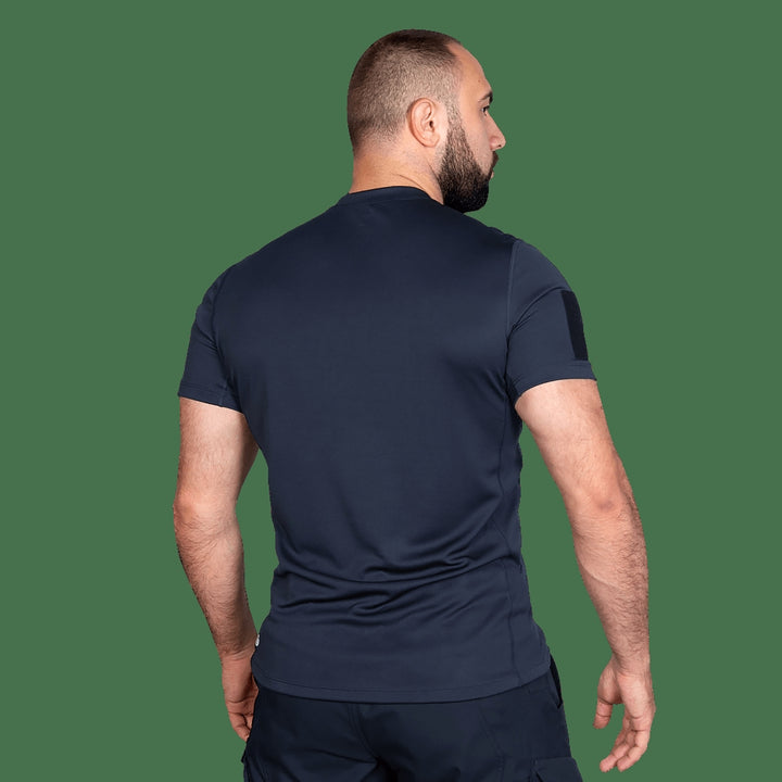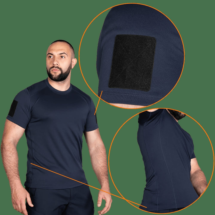 The Patrol CoolPass Pique LT T-shirt in dark blue (model 8413) is a professional uniform designed for security and paramilitary organizations. Made by camotec for active use in spring and summer, this shirt features breathable and durable properties, ensuring comfort in temperatures ranging from 59°F to 77°F.