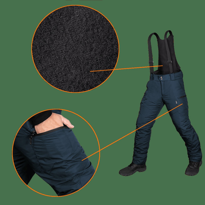 - Pants have a wide insulated waistband and adjustable leg openings for a secure fit.