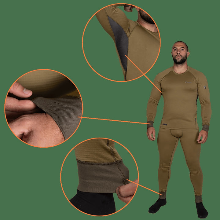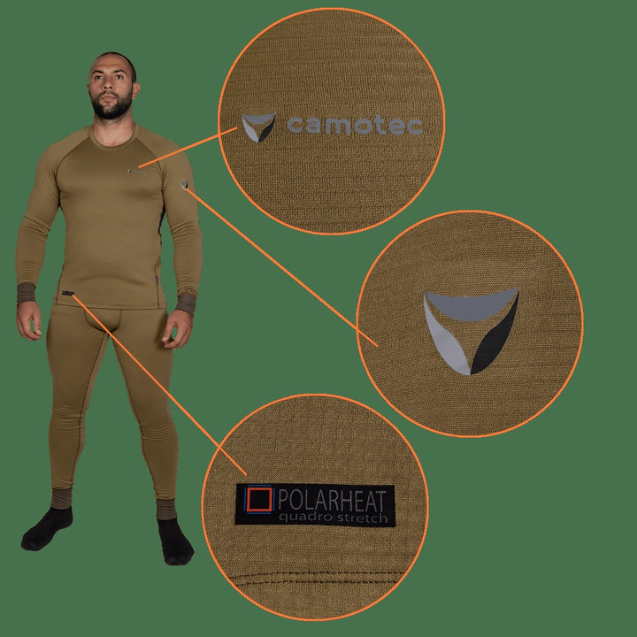 The Polarheat Quadro Stretch 3.0 Tan (7295) thermal underwear from camotec is a high-tech base layer designed for outdoor activities, tourism, and sports, as well as for use under uniform clothing in a layering system. It ensures excellent thermal insulation even in extreme climates while effectively wicking moisture away from the body for reliable thermoregulation during intense physical exertion.