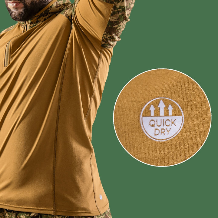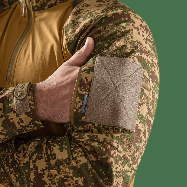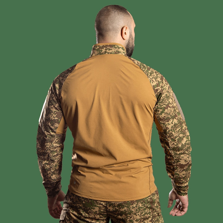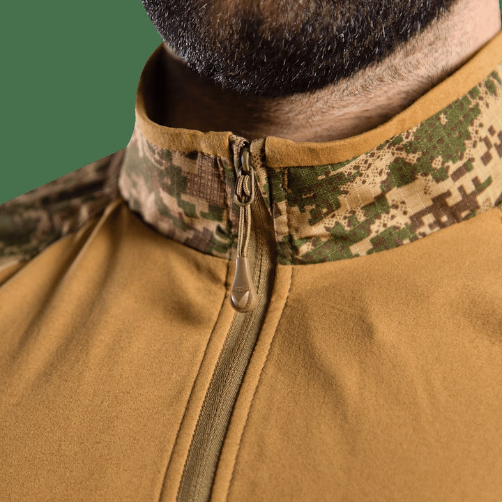 The Raid Rip-Stop/Sorona Combat Shirt (Model 8711) by camotec is a tactical UBACS (Under Body Armour Combat Shirt) designed specifically for military and paramilitary units, ideal for wear under body armor during the spring and summer seasons. This shirt combines breathable and durable materials with a comfortable design and functional details for intensive use.