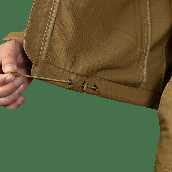 - Adjustable cuffs and hem with plastic fasteners for a customized fit