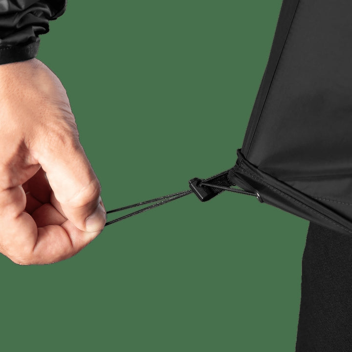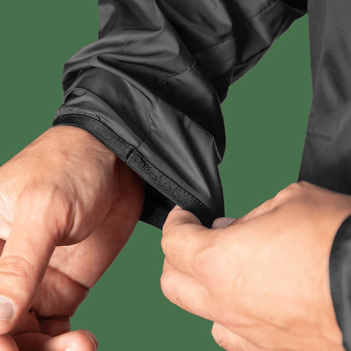 - Elastic cuffs that fit snugly against the body and an adjustable hem with plastic stoppers for quick volume adjustment.